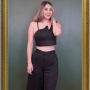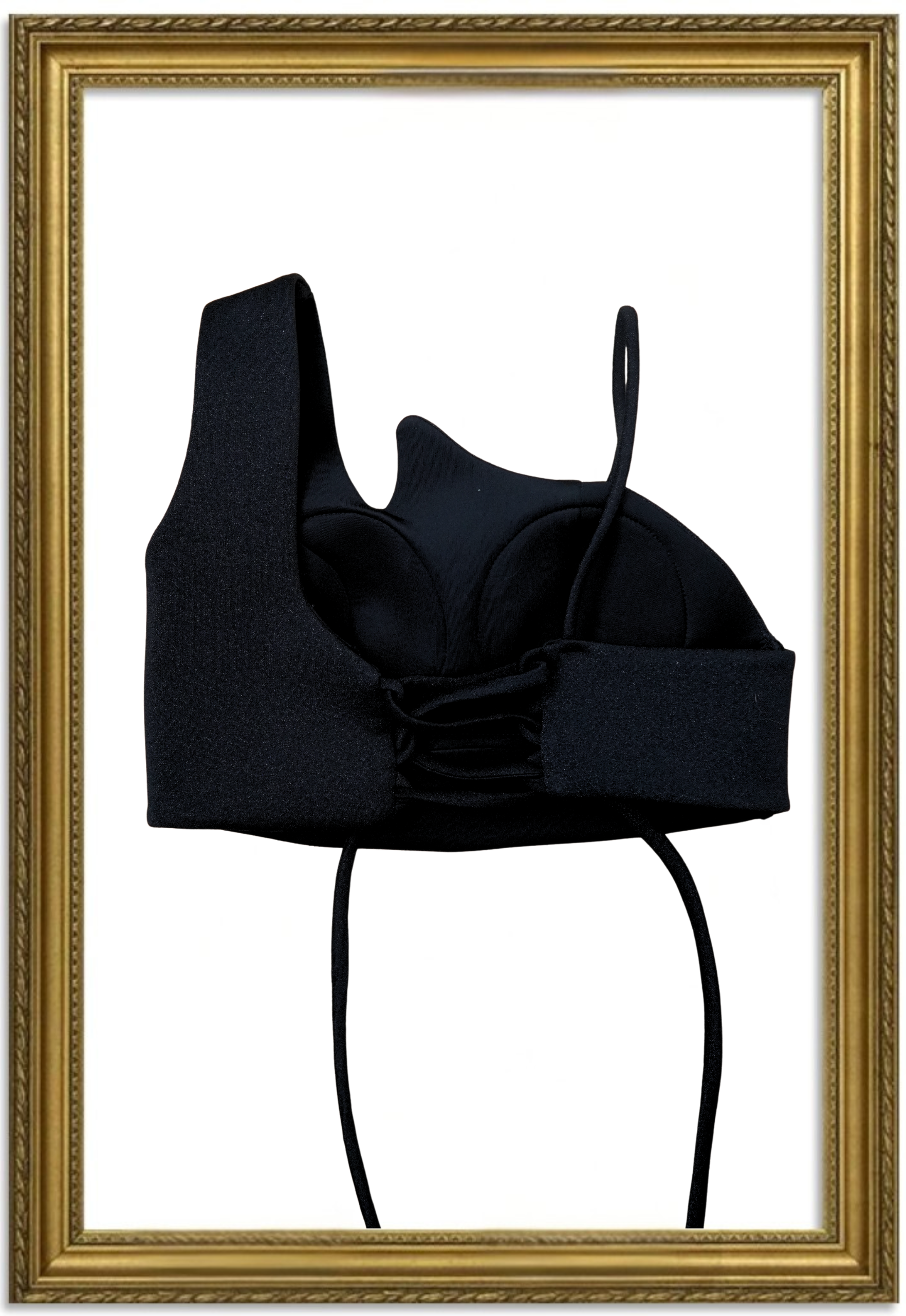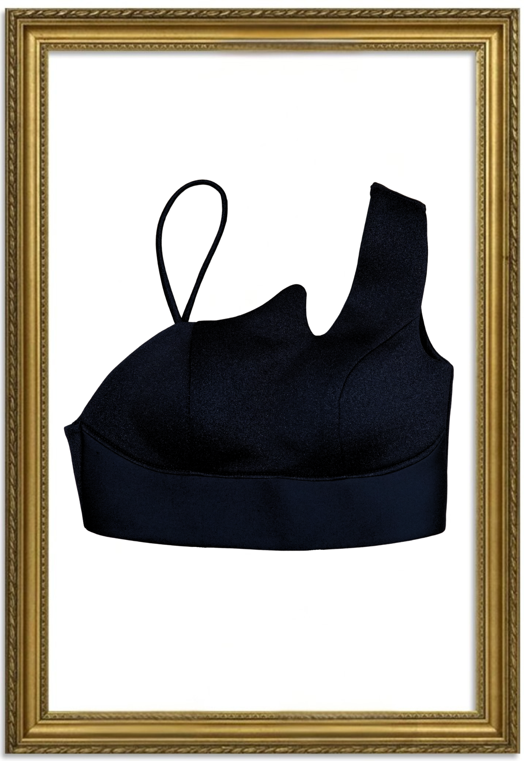 A minimalist black crop top with an asymmetric neckline and slim strap detail. Clean, modern, and effortlessly chic.