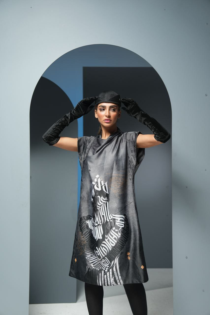 This piece is inspired by a poem of Rumi, and its design draws from the concepts of connection and balance. The flowing, intertwined lines move like a river that carries everything in its path with both softness and strength. The harmony of these lines reflects the relationship between soul and the universe, and in this dress, they come to life through movement.