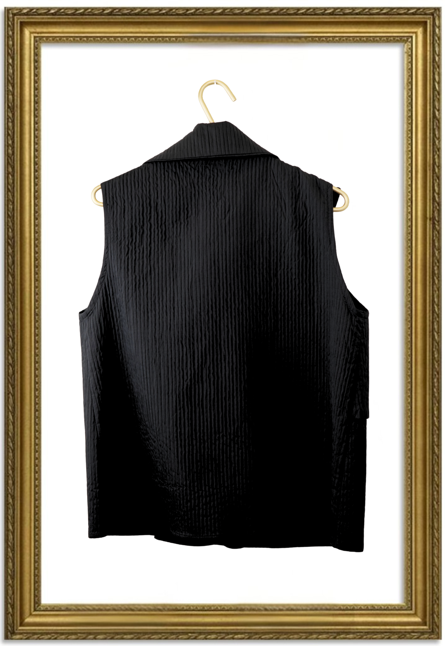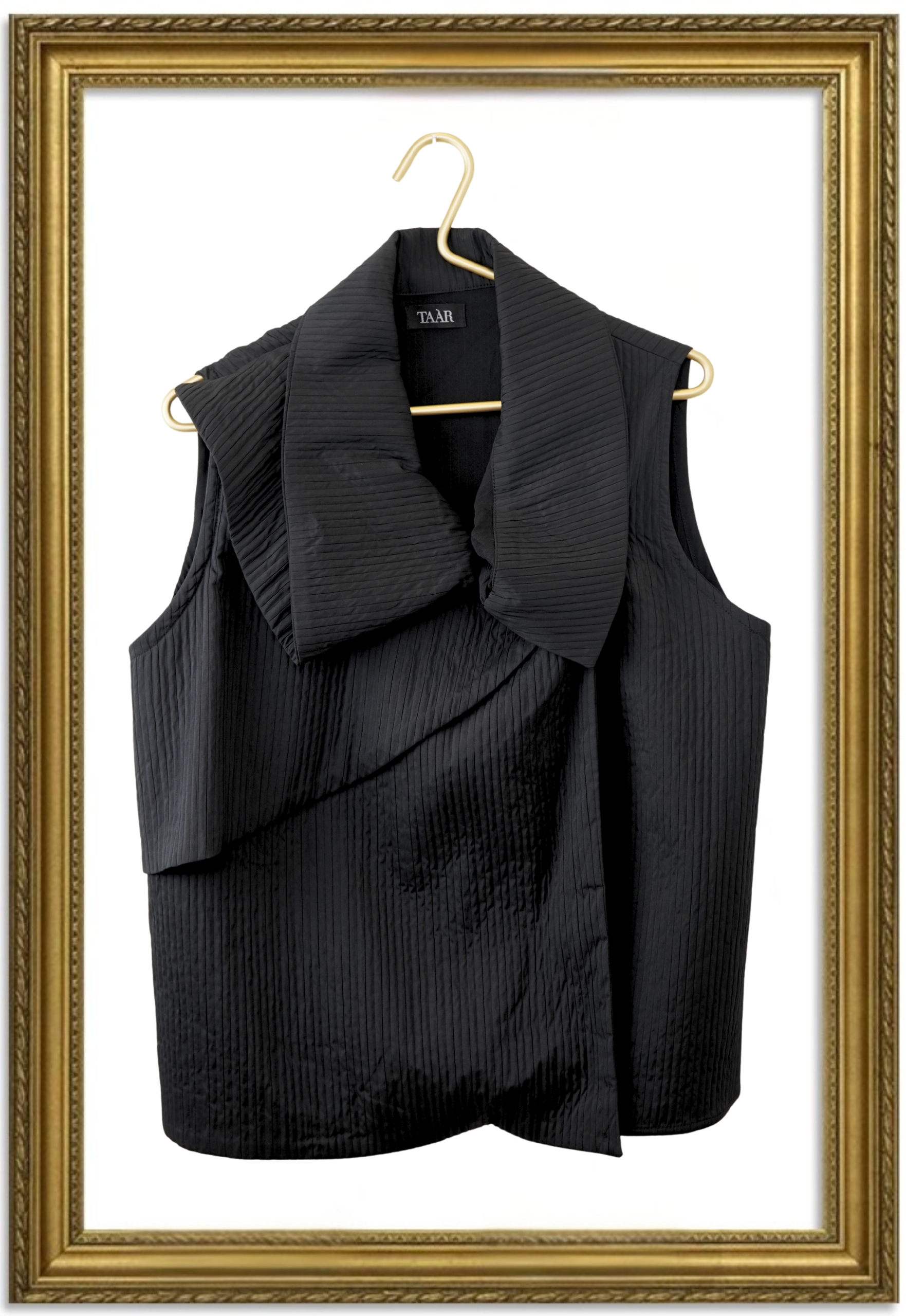 A sleeveless black vest featuring soft textured fabric and a dramatic folded collar. Structured yet fluid, perfect for refined layering.